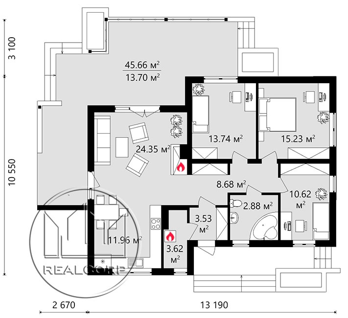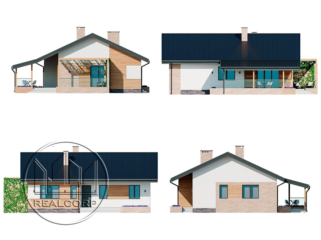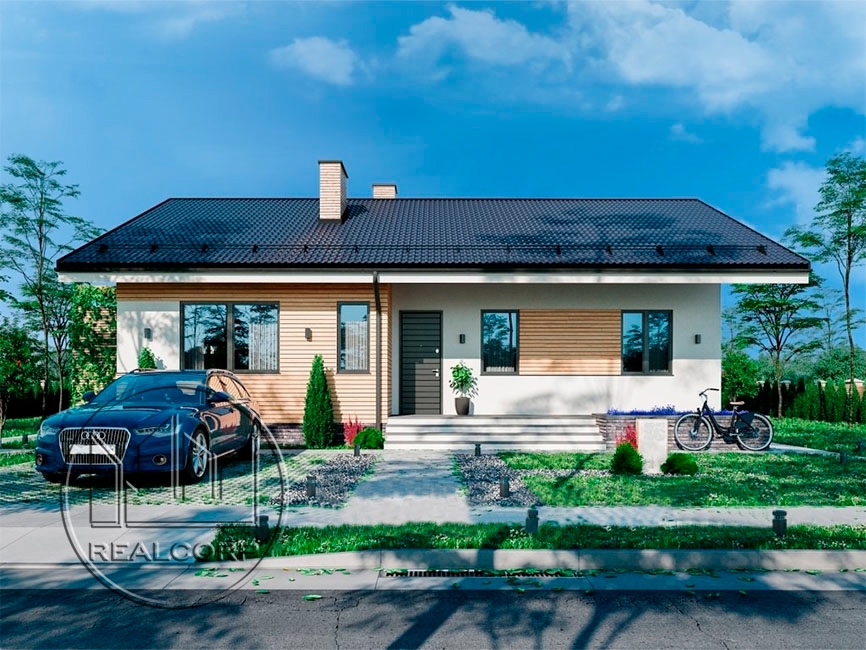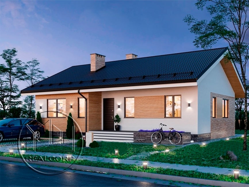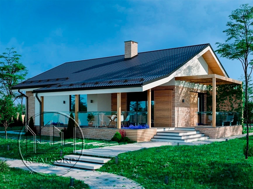 Эскизный проект загородного дома. Проект одноэтажного дома представляет собой уютное жилище для небольшой семьи. Общая площадь: 111,57 м2 Стоимость данного дома, материал и работа 8 300 000 (Проекты даны в ознакомительных целях) 📌Помните, Вы всегда можете внести изменения в типовой проект! Или заказать строительство дома по своему проекту. Комплектация: 1. Фундамент: плита, свайно ростверковый , ленточный 2. Бетонные полы 3. Несущие стены из газобетона 400 мм 4. Межкомнатные перегородки из газобетона толщиной 100мм 5. Фасад комбинированный штукатурка по базальтовому утеплителю, деревянные элементы (возможен ваш вариант отделки фасада ) 6. Разгрузочный армопояс 7. Кровля теплая 200мм базальтовым утеплителем 8. Кровля двухскатная Металлочерепица производства Гранд Лайн 9. Подшив свесов кровли ПВХ софитом производства Гранд Лайн 10. Водосточная система производства Гранд Лайн диаметр 100мм 11. Кирпичные вентшахты 12. Трубчатое Снегозадержание производства Гранд Лайн 13. Капитальное Крыльцо 14. Пластиковые окна Rehau 60 мм.