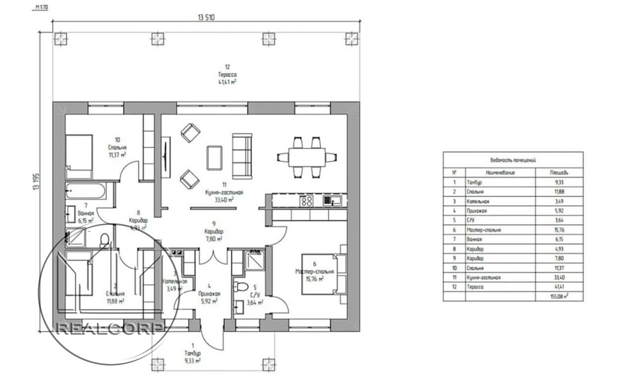 Одноэтажный дом, общая площадь с террасой 155м2 . Стоимость данного дома материал и работа 11 600 000 (Проекты даны в ознакомительных целях) 📌Помните, Вы всегда можете внести изменения в типовой проект! Или заказать строительство дома по своему проекту. Комплектация: 1. Фундамент: плита , свайно ростверковый , ленточный 2. Бетонные полы 3. Несущие стены из газобетона 400мм 4. Межкомнатные перегородки из газобетона толщиной 100мм 5. Облицовка фасада одинарным кирпичом Волга Брик , Браер 6. Разгрузочный армопояс 7. Кровля теплая 200мм базальтовым утеплителем 8. Кровля двухскатная из профнастила производства Гранд Лайн 9. Подшив свесов кровли ПВХ софитом производства Гранд Лайн 10. Водосточная система производства Гранд Лайн 11. Кирпичные вентшахты 12. Капитальное Крыльцо ( столбы, навес) 13. Пластиковые окна Rehau 60 мм. 14. Отмостка вокруг дома 15. Терраса ( открытая )