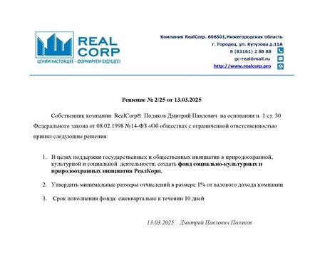 13.03.2025 Создан фонд социально-культурных и природоохранных инициатив RealCorp. В целях поддержки государственных и общественных инициатив в природоохранной, культурной и социальной деятельности, собственником компании было принято решение создать фонд социально-культурных и природоохранных инициатив РеалКорп.